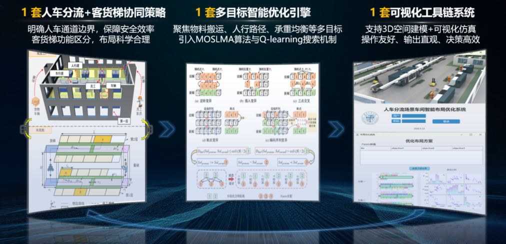 为解决人车混杂带来的安全隐患与效率瓶颈长期困扰着精益管理,智绘安行—赋能智能制造的立体车间人车分流布局一体化技术引领者应运而生,该项目聚焦双层车间人车分流与客货梯协同优化,构建“1+1+1”一体化智能布局系统,融合算法引擎与可视化工具链,实现空间建模、智能求解与仿真验证,突破经验式设计,推动车间布局向智能、安全、高效转型。