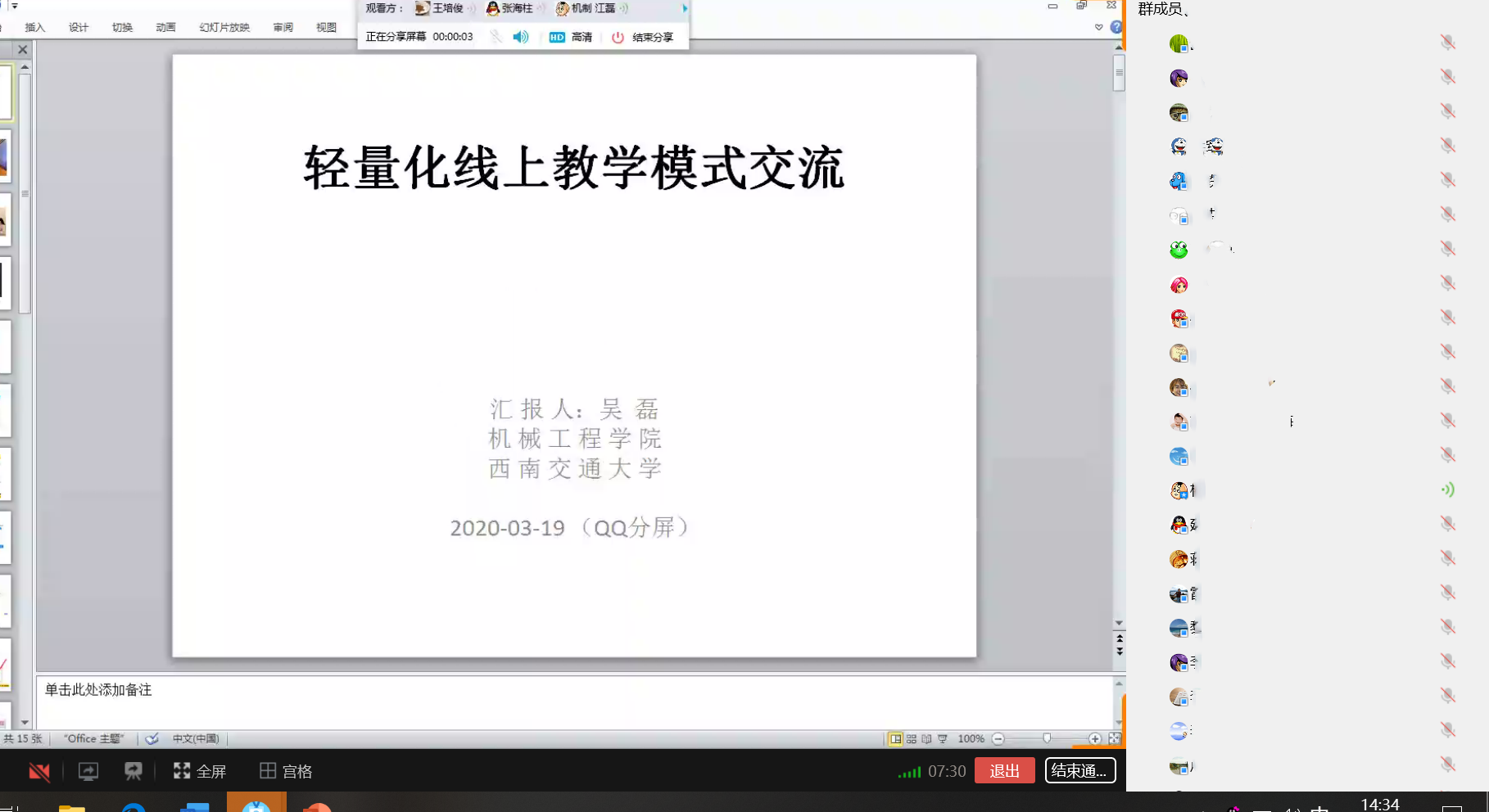 为持续了解学院线上教学情况,搭建交流平台,确保停课不停学取得良好效果,2020年3月19日下午14:30开始,学院在教工QQ群举行第二期线上教学课程研讨会。研讨会由副院长田怀文主持,各系所教研室共计100余名教师通过QQ网络直播参与线上教学研讨会。