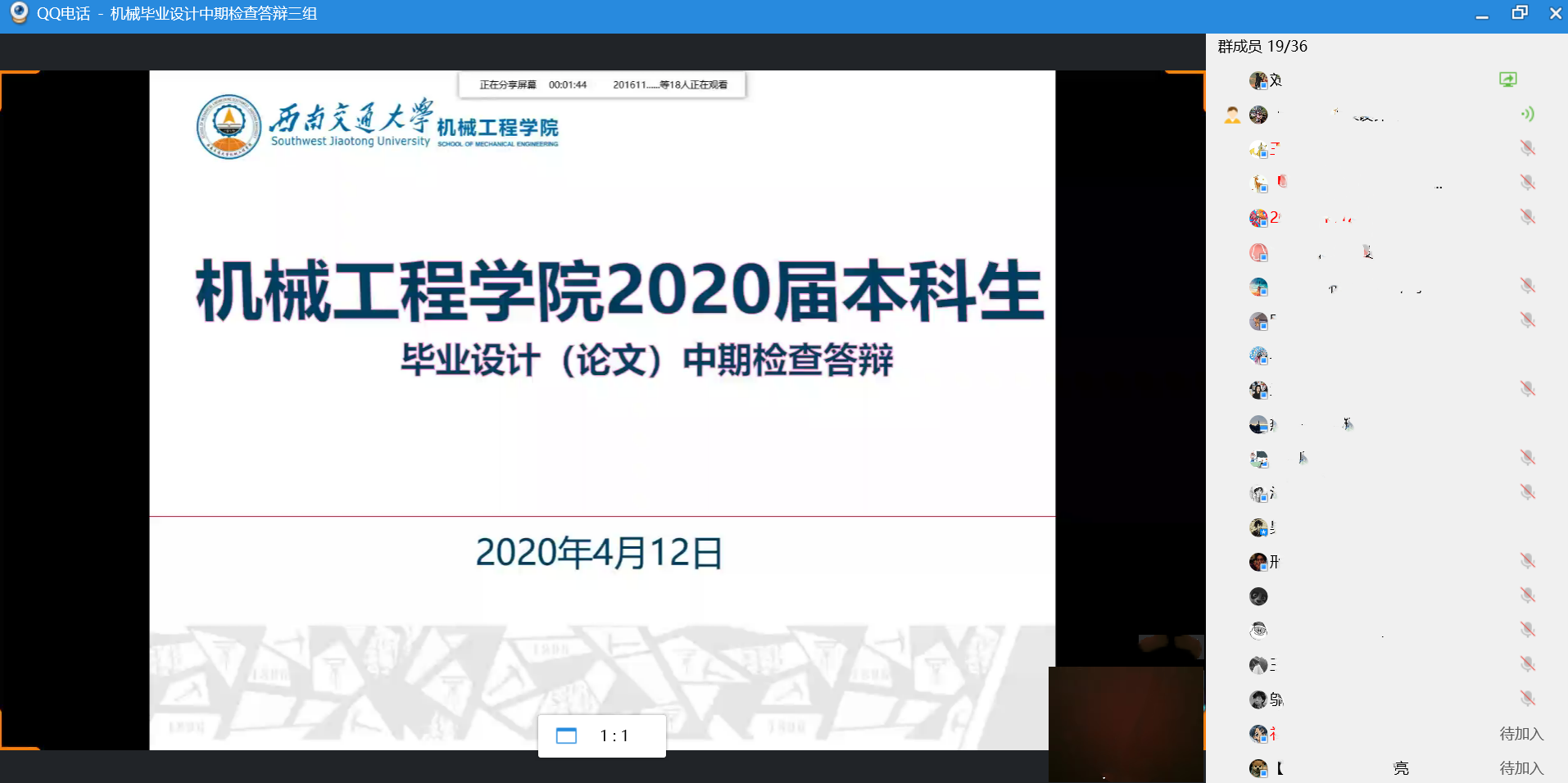 为充分了解学生毕业设计(论文)进展情况,学院发布《学院2020届本科生毕业设计(论文)校级中期检查抽查答辩安排》,对学生答辩时间和答辩内容进行要求。每位学生答辩时间为8-10分钟,围绕三个部分内容进行汇报:1.对毕设题目的理解;2. 目前毕设完成情况;3. 存在的问题或下一步工作计划。答辩前,各答辩小组秘书组织师生进行了网络测试,学生熟悉平台使用和屏幕分享等功能,并对线上答辩有可能出现的情况进行了周密的预案。答辩中,评委老师根据学生的汇报,针对毕业设计(论文)中出现的问题提出解决方案和参考意见,更好的帮助学生明确下一步工作方向。