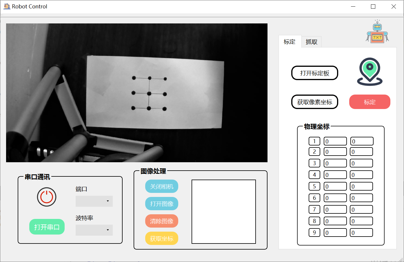 手眼标定采用九点标定算法,九点标定就是让机械手的末端去走这就9个点得到在机器人坐标系中的坐标,同时还要用相机识别9个点得到像素坐标。这样就得到了9组对应的坐标。