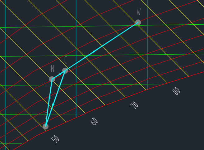 =3360 m³/h可得到回风量为18593.3m³/h, 新风比为 15.31%,进而可以得到混合状态点C: