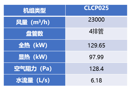 全空气系统冬季的空气调节过程和夏季类似,冬季空气调节过程计算完成后可以得到冬季的送分量和根据以上计算数据选择特灵组合式空气处理机,其中一层大厅选择1台CLCP025空气处理机组,具体参数见下表: