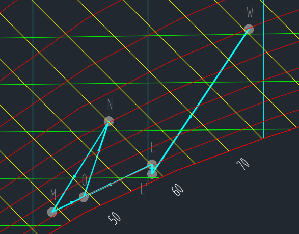 = 50.6kJ/kg;由于O点的相对湿度大于90%,送风状态点O已经处于机器露点区域,因此送风转台点O和机器露点L重合。