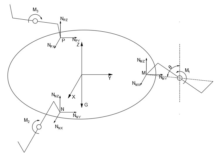 (4)攀爬机构的力学分析,如图8所示,绝缘子对攀爬机构的支反力属于空间力系问题,故为每个接触受力点建立对应的空间直角坐标系。由于检测机器人的运动具有周期性,并且攀爬爪是交替接触在绝缘子表面上的,在旋转角度区间为45°